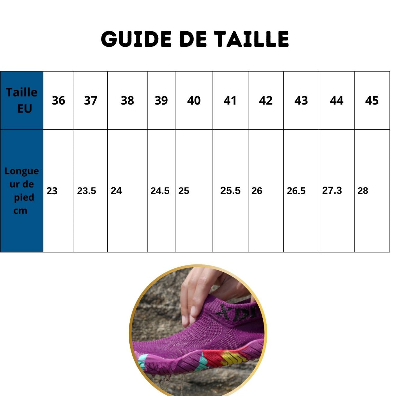 Prends simplement ta pointure habituelle. Les AquaLibre™ sont conçues pour s’adapter facilement au pied, comme un chausson souple. Si tu es entre deux tailles, choisis la plus grande pour plus de confort.