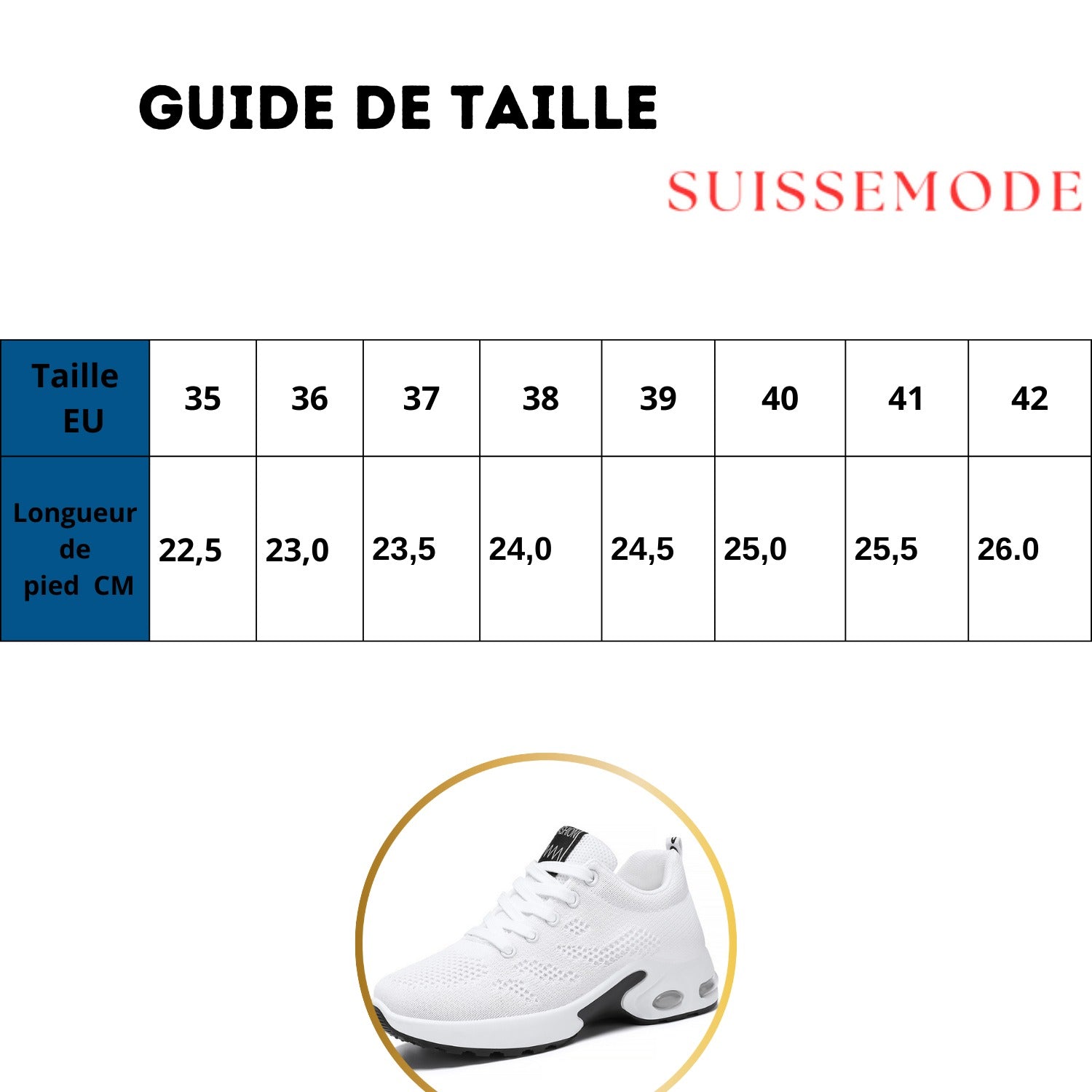 Nous recommandons de prendre votre pointure habituelle. Si vous êtes entre deux tailles, choisissez la plus grande pour un confort optimal. Un guide des tailles clair est disponible sur la page produit.