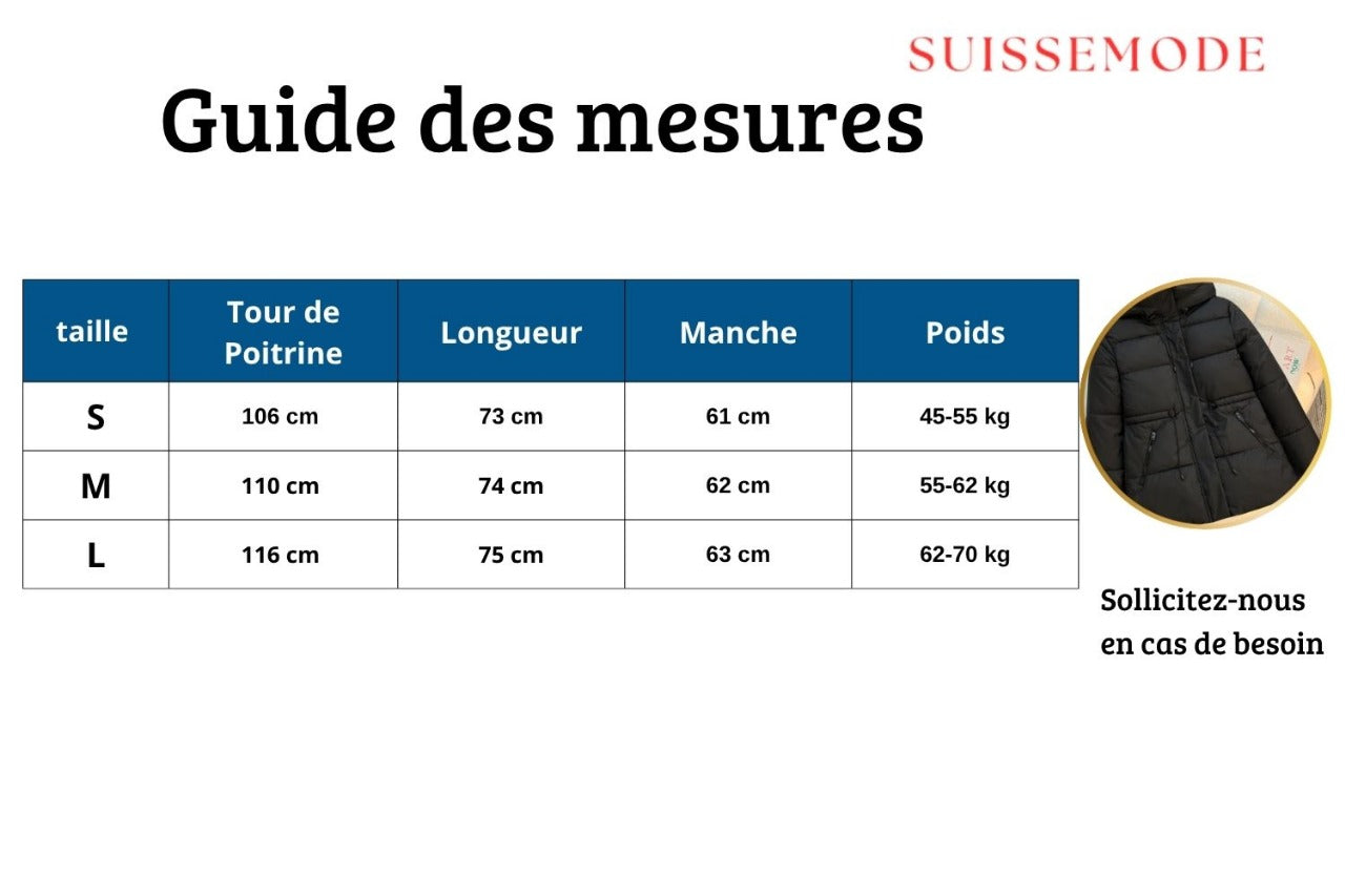 Notre manteau est disponible dans une large gamme de tailles. Pour vous assurer un ajustement parfait, consultez notre guide des tailles. Si vous hésitez entre deux tailles, nous recommandons de prendre la taille au-dessus pour plus de confort.