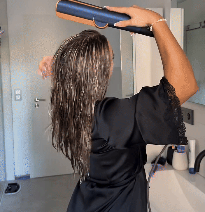 Tout dépend de ta longueur et de ton volume, mais en moyenne entre5 et 10 minutessuffisent pour un résultat impeccable. Un vrai gain de temps pour les matins pressés !