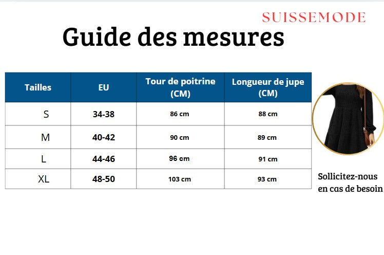 La robe est disponible du S au XL. Consulte notre guide des tailles pour trouver celle qui convient à ta morphologie. Si tu es entre deux tailles, prends la plus grande pour plus de confort.