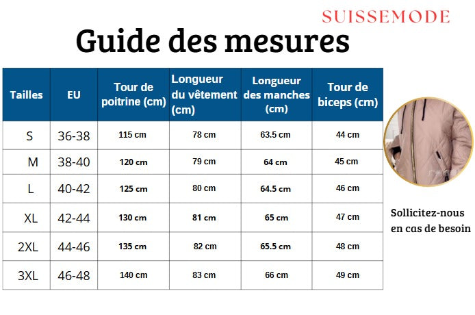 La coupe est légèrement ajustée pour un look féminin 👗. Si vous hésitez entre deux tailles, prenez celle au-dessus pour pouvoir porter un pull dessous sans gêne. Un guide des tailles détaillé est disponible sur la page produit.
